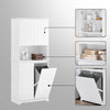Be apatinės spintelės, skirtos plauti nešvarumus ar kitus daiktus, trys atviros lentynos viršuje ant šio aukšto spintelės puikiai tinka popieriniams rankšluosčiams, rankšluosčiams ar kitoms tualeto reikmenims.
